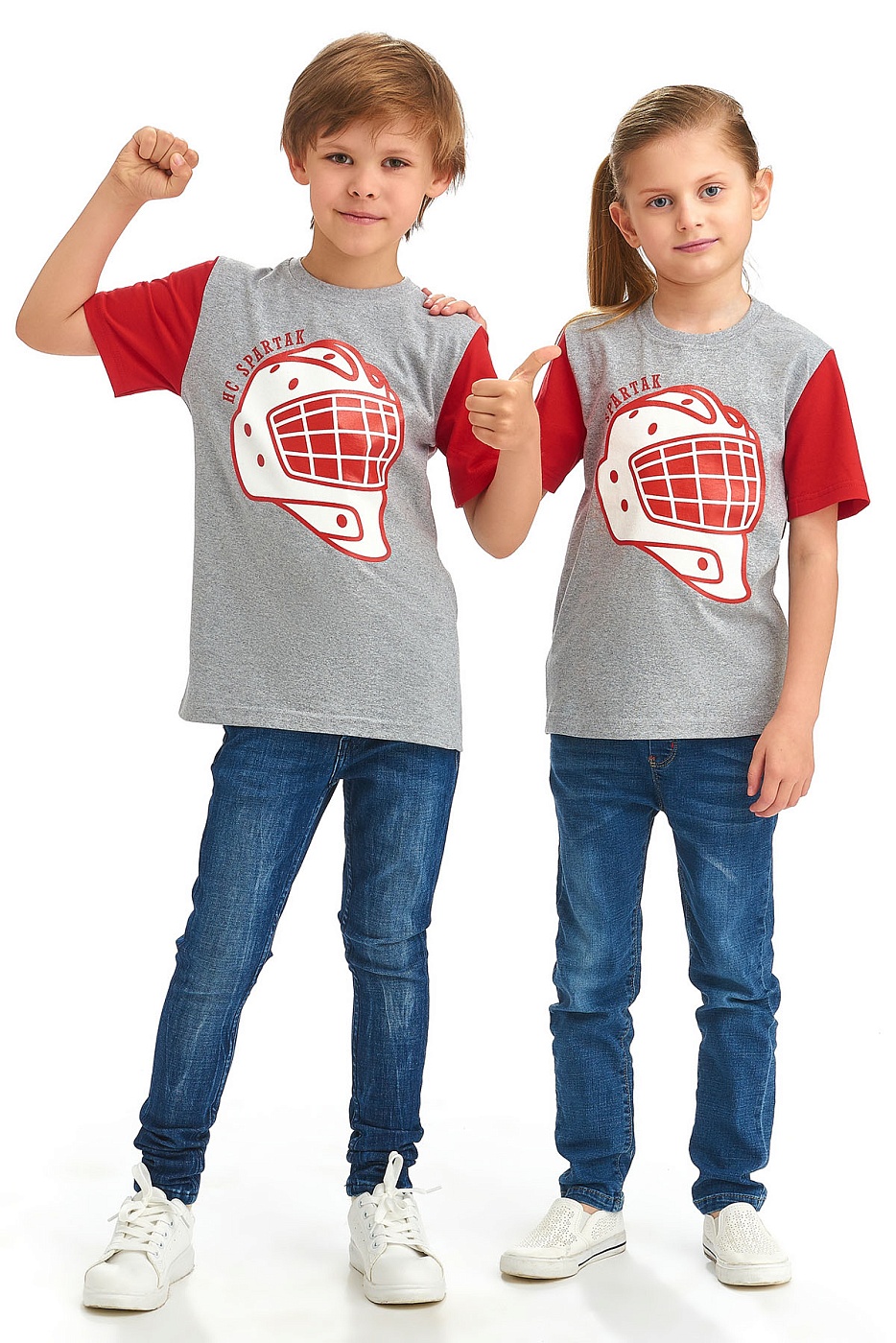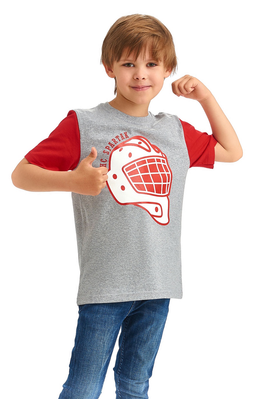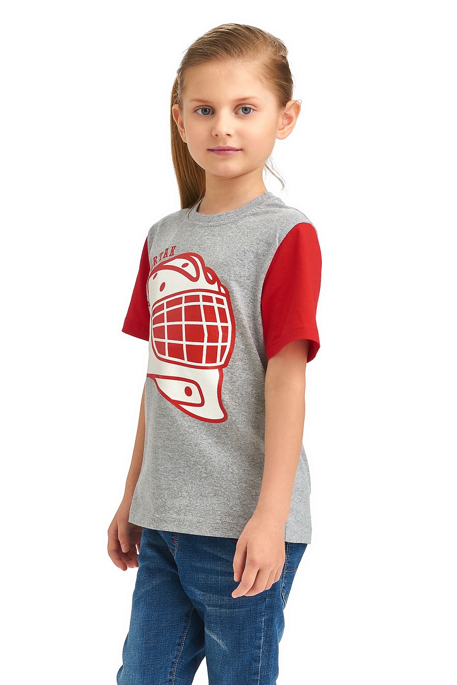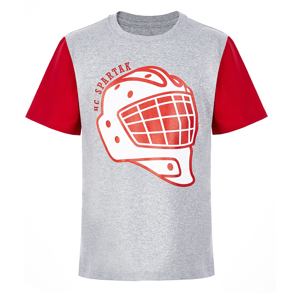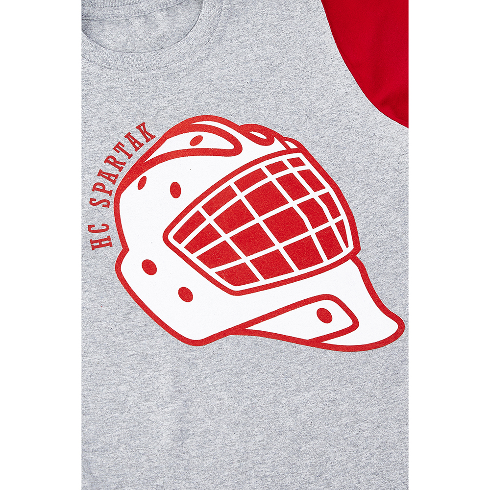Вратарь – половина команды! Серо-красная детская футболка декорирована большим вратарским шлемом. Прекрасный выбор для юных стражей ворот.