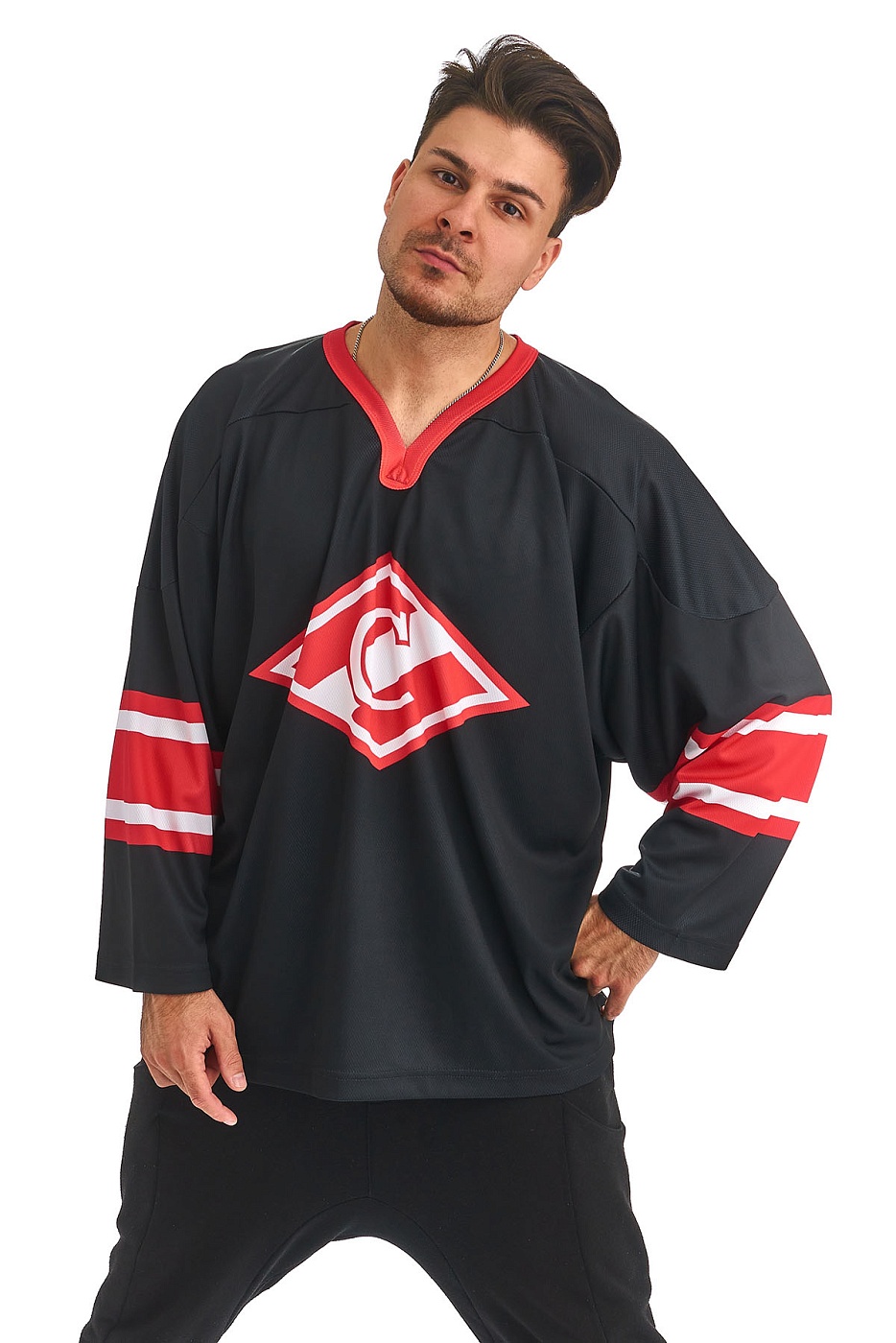 Свитер представлен в третьем черном варианте. На груди гордо красуется большой спартаковский ромб. На спине знак: «Сила и Честь». Отлично подойдет для тренировок и посещения матчей любимого клуба.